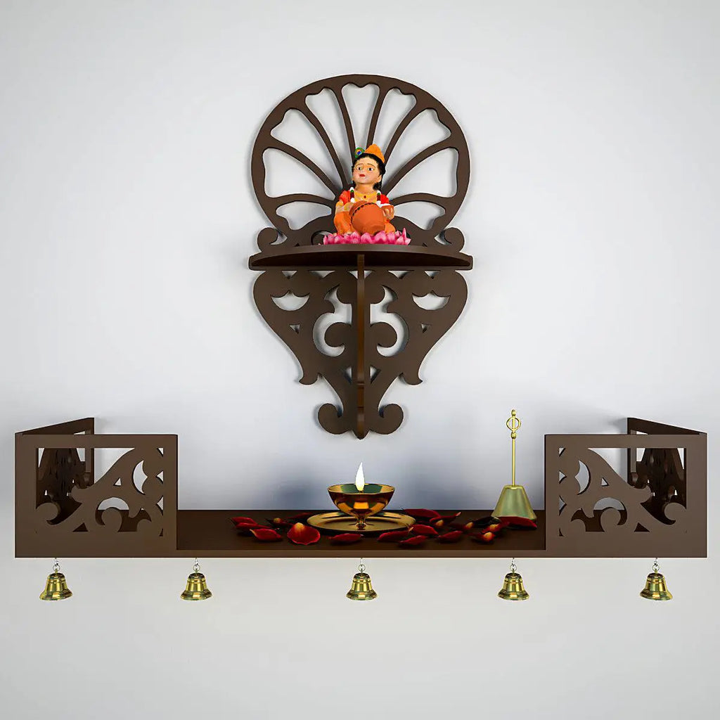 Beautiful Wall Hanging Wooden Temple/ Pooja Mandir Design with Shelf, Brown Color