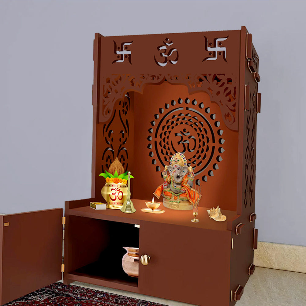 Designer Om Chakra Floor Temple with Spacious Wooden Shelf & Inbuilt Focus Light- Brown Finish