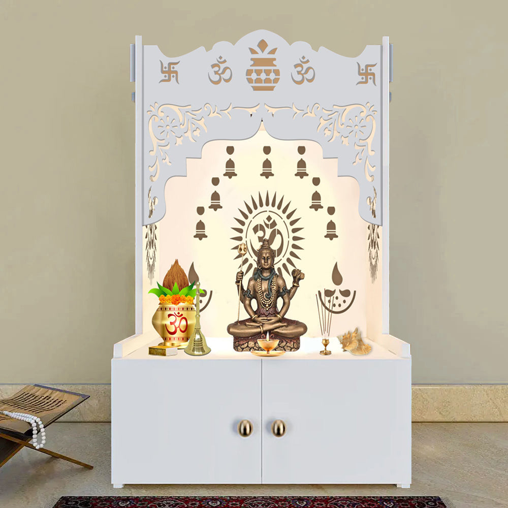 Holy Symbol Om Chakra Floor Temple with Spacious Wooden Shelf & Inbuilt Focus Light- White Finish